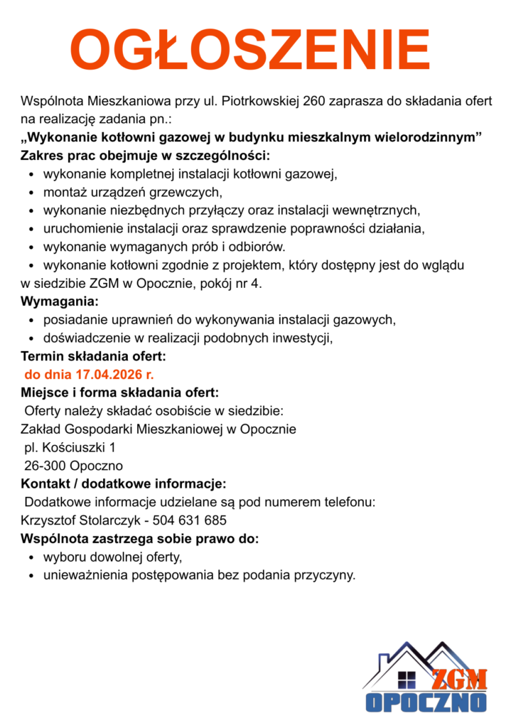 Zakład Gospodarki Mieszkaniowej w Opocznie zaprasza do składania ofert na wykonanie wymiany orynnowania w budynku wielorodzinnym.