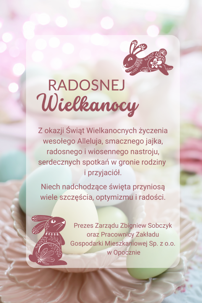Zarząd Zakładu Gospodarki Mieszkaniowej sp. z o.o. informuje, że zgodnie z Zarządzeniem nr 3/2025 z dnia 11 kwietnia 2025 r. w dniu 18 kwietnia 2025 r. (Wielki Piątek) Zakład będzie czynny w godzinach od 7:00 do 12:00.